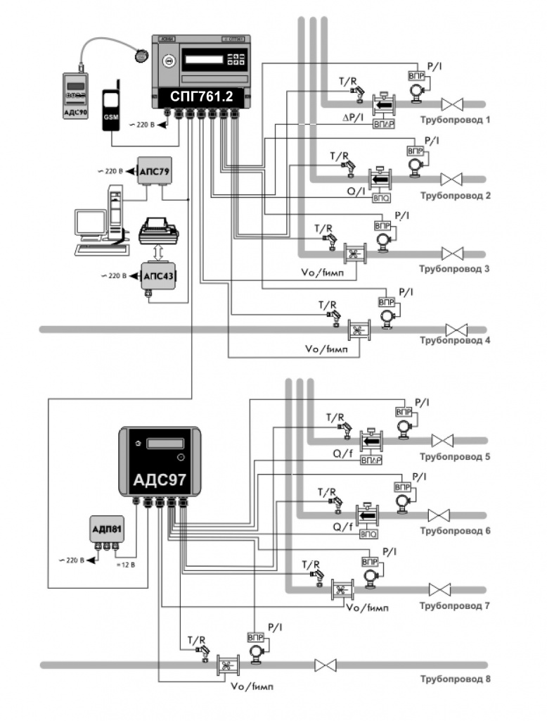 Непосредственно к прибору могут быть подключены:Для модели 761.2 посредством адаптеров АДС97, подключаемых по дополнительному интерфейсу RS485, количество входов для подключения датчиков может быть увеличено.